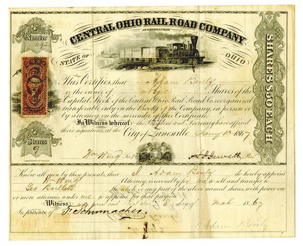 Ohio. 9 Shares Capital Stock Issued Certificate, Black print on black border, Locomotive on tracks at top with revenue stamp at left side, VF-XF condition, Toppan, Carpenter and Co.
