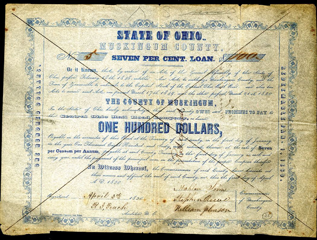 Muskingum County, Ohio, 1850, $100, Unlisted, Issued and pen cancelled bond, Cert.#10, Muskingum County 7% Loan of 1850. Blue on parchment type of paper that is toned, Signed by Auditor (R.J.Peach) and 3 different Muskingum Commissioners, toning and soiling on the right, top and left margins, edge faults and some separation at folds otherwise a respectable example of this rare and early Ohio Railroad bond that is unlisted in Cox.