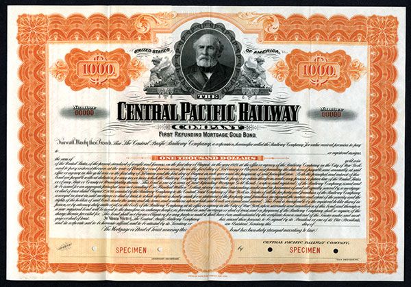 Utah, Orange border, C.P. Huntington on top, 1st Refunding Mortgage gold bond, XF, ABNC. Rare bond in any form.