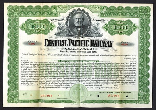 Utah, 1899, $10,000, Registered 1st Refunding Mortgage 4% Gold Bond. Black on green border and underprint, portrait of Collis P. Huntington, Specimen overprints, POC's, XF condition. Rare and attractive bond. ABNC. Historic bond. The Central Pacific laid rails from California to Utah and met up with the Union Pacific in 1869 forming the first transcontinental railroad. ABNC.