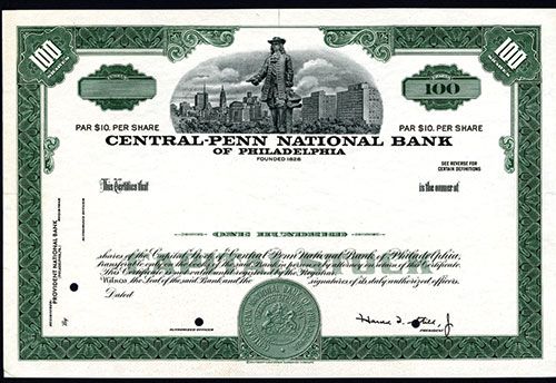 Pennsylvania, ND, Stock Proof, 100 Shares, Black print on green border and underprint, William Penn statue in front of Philadelphia top center, POC's, VF-XF condition, SCBNC.