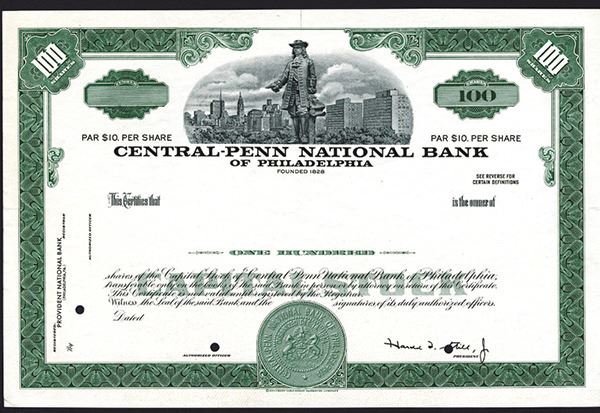 Pennsylvania. 100 Shares Stock Proof Certificate. Black print with green border and under print. Vignette of William Penn statue in front of Philadelphia skyline at top center. POC's, VF-XF condition, SCBNC.