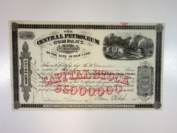 New York, 1866, 100 Shares, I/U, Stock, S/N 160, Black ornate border, Oil well with barrels and storage facility along with their offices top center, VF condition, Hatch & Co.