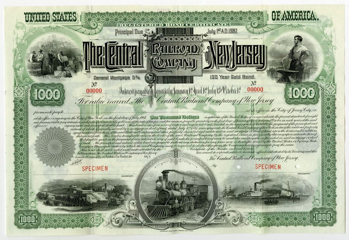 New Jersey, 1887. $1000 Specimen 5% Registered General Mortgage Gold Bond, Black text with green border and underprint, Men loading a ship at top left, Man with an anvil at top right. Red specimen overprints, 00000 serial numbers, and POCs. XF-AU condition, ABNC.