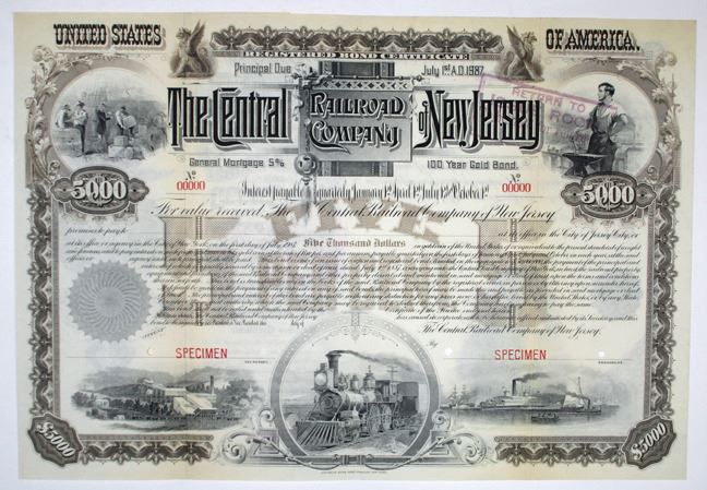 New Jersey, 1888. $5000 Specimen Registered 5% General Mortgage 100 Year Gold Bond, Black on brown border and underprint, Blacksmith at top right, workers on dock at top left, harbor scene lower right, factory or mill lower left with large train in middle bottom center flanked, ornate title on top with light brown underprint, Horizontal format, Red specimen overprints, '00000' serial numbers, POCs. VF condition, ABNC. Only known as a specimen in Cox, no issued examples known. This is one of the most attractive and impressive looking bonds we have had the privilege to offer.