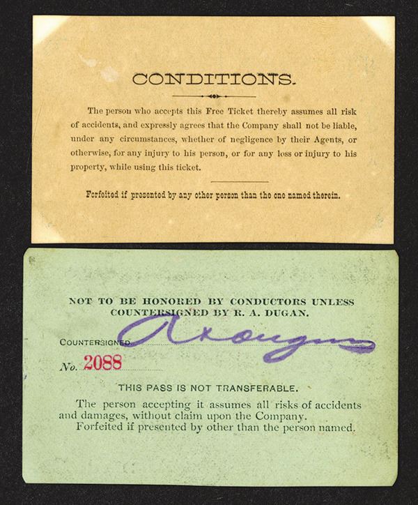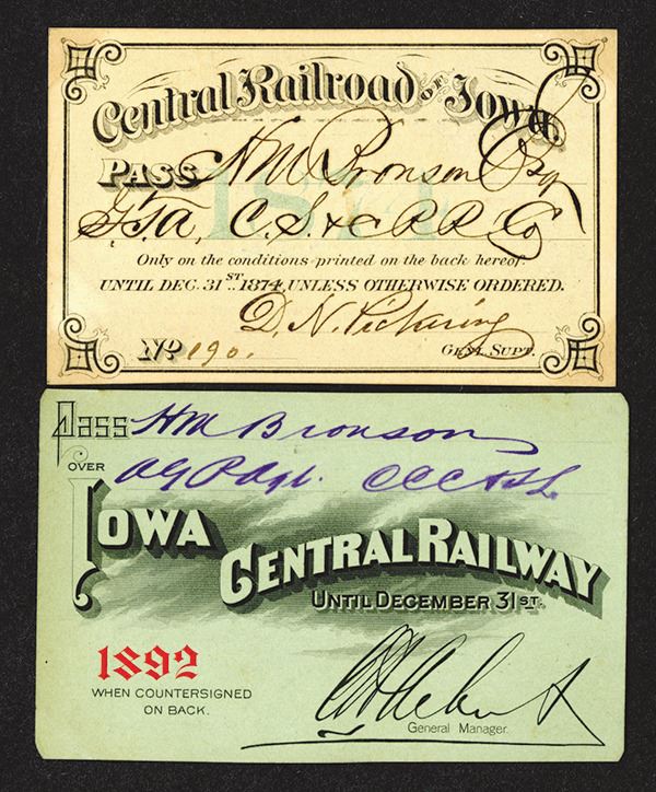 Iowa. Lot of 2 passes, includes 1874 and 1892 passes respectively. The first with some paper tone, mostly on back, from an old album mounting. 2 pieces.