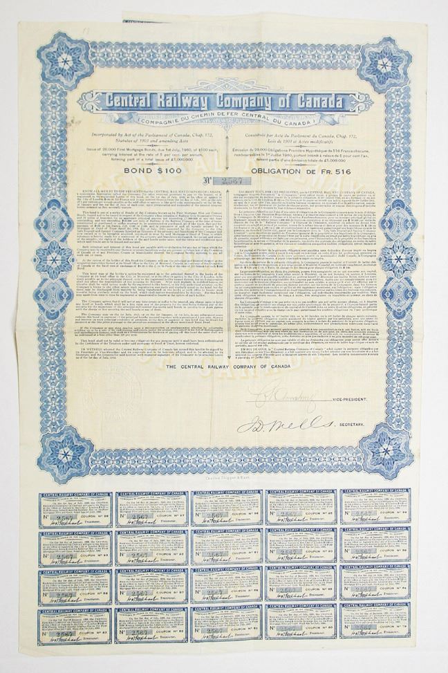 Canada, 1911. $100, I/U 5% Coupon Bond, Blue print on blue border and yellow underprint, Company title at top, Certificate is printed in English and French, VF-XF condition with minor toning, Charles Skipper & East. Rare bond listed in Cox, but not pictured. This is the first time we have offered this railroad.