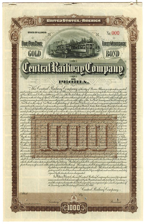 Illinois. 1895. Specimen bond. $1000. 1st Mortgage 5% Gold Bond. Brown border and undertint. Interurban electric street cars. Red "000" serial numbers and POC's. XF condition. Only known as specimen. Coupons attached. Rare and attractive bond. WBNC. Unlisted railroad in Cox. Possibly unique.