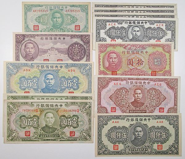 China - Puppet Banksƒ... Lot includes a study group of 1, 5, 10, 100, 500, 5000, and 10000 Yuan notes dated between 1940 and 1945. P-J8; J10 (3); J12 (2); J19; J20; J21; J23; J24 (9); J27; J28; J37; J41; J42 (4). VF to AU. (28)