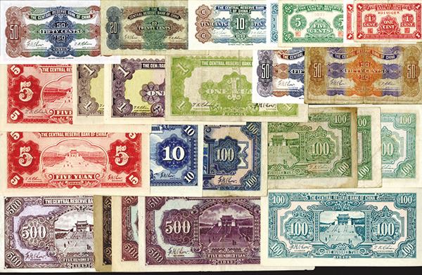 China - Japanese Puppet Banks. 1, 5, 10, 20, 50 Cents, 1, 5, 10, 100, 500 Yuan. P-J1a, 1b, 2a, 2b, 3a, 4a, 5a, 6, 7, 8a, 9c (2), 10c, 10e, 12h, 14a, 16a, 17a, 18a, 19a, 20a, 21a (2), 21a Error - missing ink, 23a, 24b, 25b, 26a, 27a, 28b. Fine to Extremely Fine, two or three Very Good with rough edges. 30 pieces.