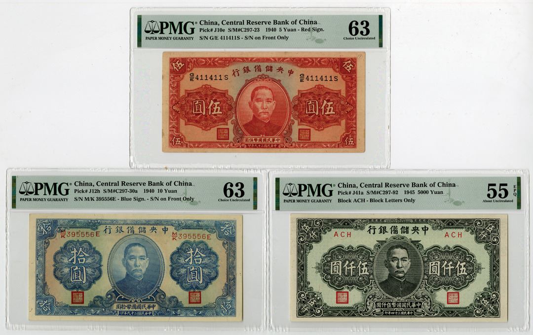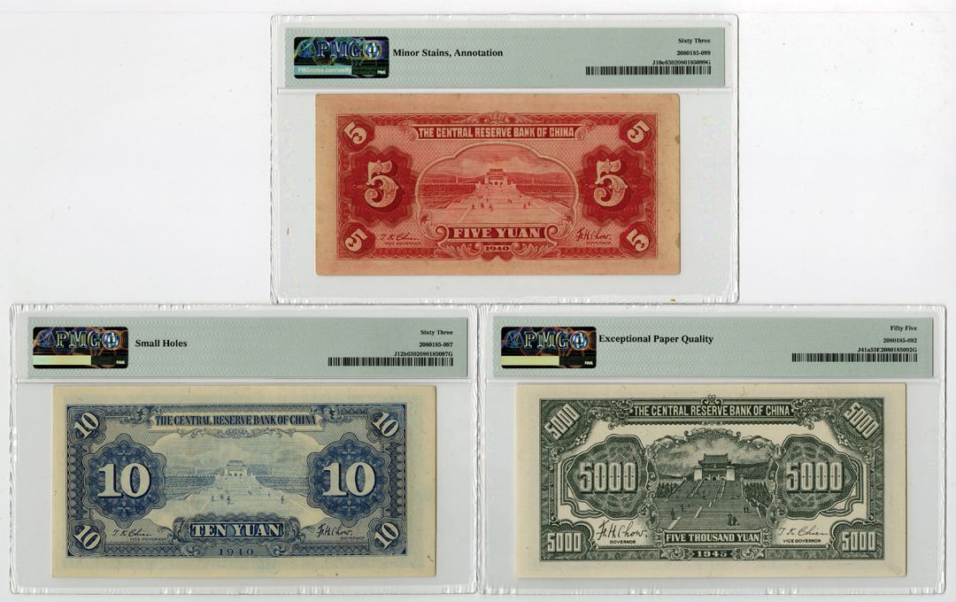 China. 1940-45. Lot of 3 Issued banknotes: 5 Yuan, P-J10e S/M#C297-23, PMG graded Choice Uncirculated 63 with comments "Minor Stains, Annotation"; 10 Yuan, P-J12h S/M#C297-30a, PMG graded Choice Uncirculated 63 with comment "Small Holes"; and 5000 Yuan, P-J41a S/M#C297-92, PMG graded About Uncirculated 55 EPQ. (3)
