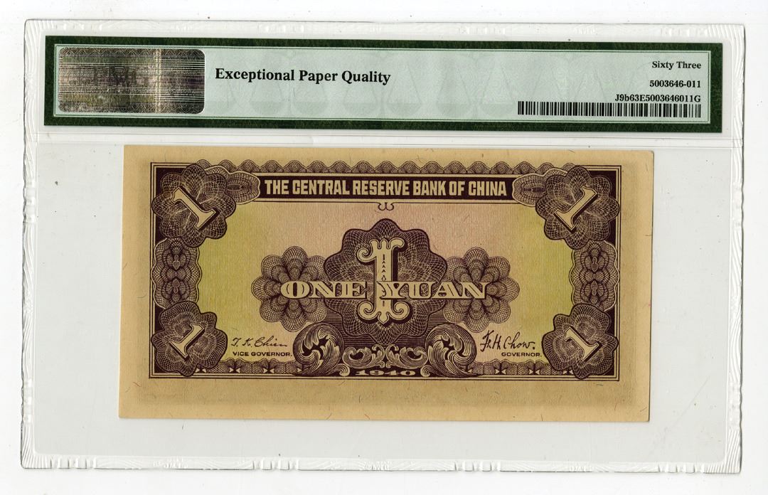China, 1940. 1 Yuan, P-J9b S/M#C297-20, Issued Banknote, Purple on purple and green underprint, SYS at left and Temple entrance at center, Back is purple on green underprint, S/N RX549336N, PMG graded Choice Uncirculated 63 EPQ.
