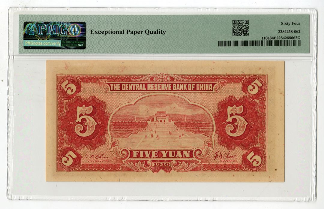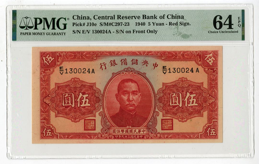 China, 1940. 5 Yuan, P-J10e, S/M#C297-23, Issued Banknote, Red on orange and blue underprint with portrait of SYS at center, S/N E/V 130024A, PMG graded Choice Uncirculated 64 EPQ.