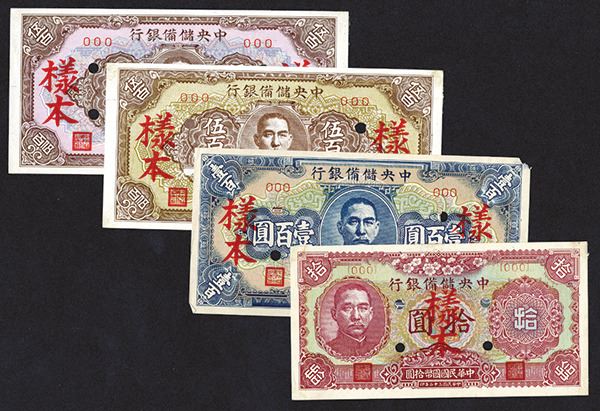 China, Lot of 4 Specimens, Includes 10 Yuan, J-20s; 100 Yuan, J-23s; 500 Yuan, P-J27s and P-28s, the 500 Yuan notes have mounting remnants on the left back, all have Yang Pen and Specimen overprints, the 10 Yuan has POCs, mostly Choice Fine to AU. Scarce as specimens.