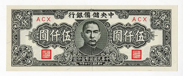 China, 5000 Yuan, P-J42, Issued, Black, SYS at center, back black, Block (ACX), Choice AU with one light vertical middle fold keeping the note from CU condition. Rarely seen this nice.
