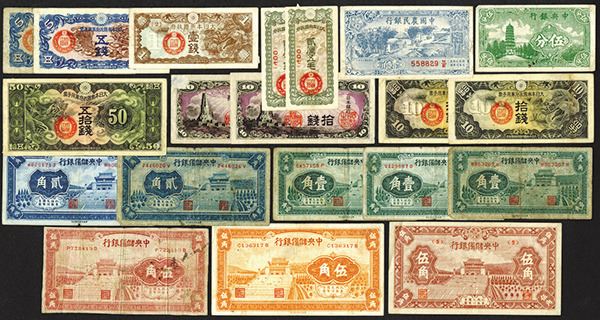 China. 10, 20, 50 Cents. SCWPM J3a (2), J4a (2), J5a, J6, J18 b; Military. M7, M9 (2), M12 (2), M14. plus four others. Some with mounting remnants or staple holes. Generally Very Good. 20 pieces.