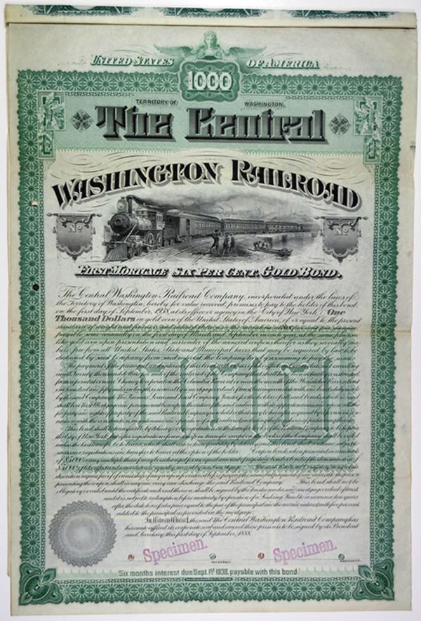 Washington Territory. $1000 Specimen 6% First Mortgage Gold Coupon Bond, Black text with green border and undertint, Scene of a train passing by men with factory in the background at top. Purple specimen overprints, no serial numbers, POC's, Fine condition with some markings along right margin and some toning, ABNC. Rare specimen in Cox with only 2 found in the ABN Archives in 2002.