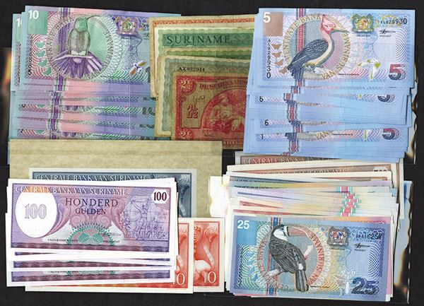 Suriname. 1, 2-1/2, 5, 10, 25, 100, 250, 500 Gulden. SCWPM 116i; 119 (4); 120b (2); 121a (2); 128b (11); 129 (14); 132b (6); 133b (4); 134; 136a (5), b 1998 (7); 137b 1996 (4), 1998 (3); 138a (3); 146 (44); 147 (28); 148, 149. All Uncirculated or choice. Plus earlier issue 1942, 2 1/2 Gulden, P-87b, VG.
