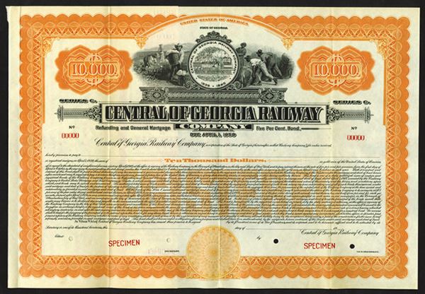Georgia, 1919. $10,000 Specimen 5% Registered Refunding and General Mortgage Bond, Black text with orange border and underprint, Company logo at center flanked by scenes of men at work. Red specimen overprints, 00000 serial numbers, and POCs. Fine condition, ABNC. Rare specimen in Cox.