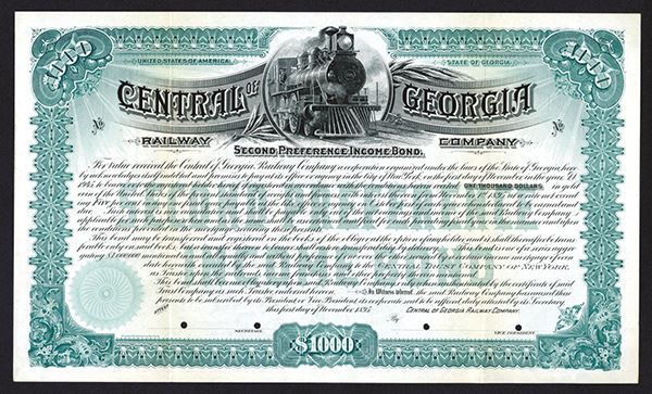 Georgia, 1895, $1000 2nd Preference Income Specimen Bond, Black printing with green border and underprint, Moving locomotive top center, POC's and red SPECIMEN overprints, VF-XF condition, ABNC. Listed railroad in Cox but unlisted bond variety.