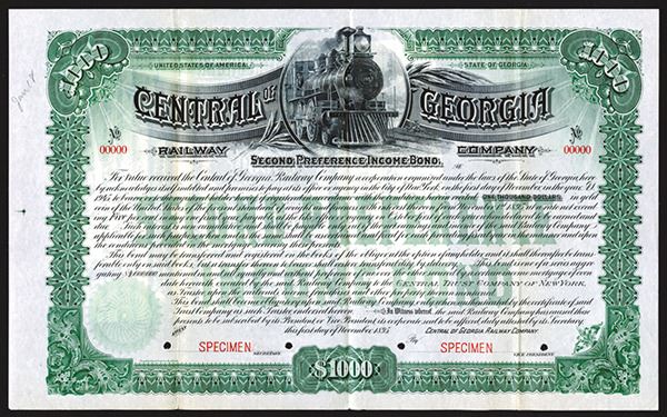 Georgia, 1895, $1000 2nd Preference Income Specimen Bond, Black printing with green border and underprint, Moving locomotive top center, POC's and red SPECIMEN overprints, VF-XF condition, ABNC. Listed railroad in Cox but unlisted bond variety.