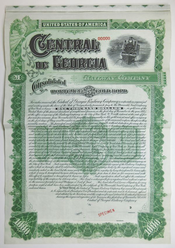 Georgia. $1,000 Specimen 5% Consolidated Mortgage Gold Coupon Bond, Black print on ornate green border and under tint, Small image of locomotive head on top right besides company title at top left, Specimen overprint and POC's, VF-XF condition, IBNC. Listed on Cox as Issued and Cancelled Certificate. Only 3 examples found in the ABN archives in 2002.