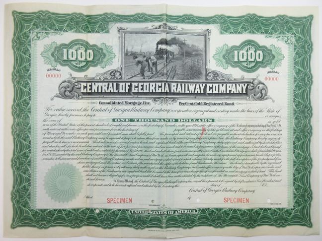 Georgia. $1,000 Registered 5% Specimen Consolidated Mortgage Bond, Black print on green border and under tint on horizontal format, Workers beside tracks with approaching locomotive, Specimen overprints and POC's, VF-XF condition, ABNC.