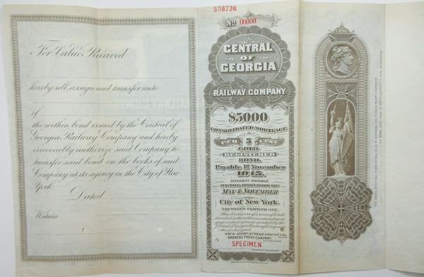 Georgia. $5,000 Registered 5% Specimen Consolidated Mortgage Gold Bond, Black print on brown border and under tint on horizontal format, Locomotive approaching with track workers at siding, Specimen overprints and POC's, VF-XF condition, ABNC. Specimen listed on Cox has overprint stamp- this version does not.