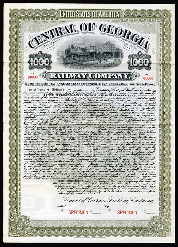 Georgia. $1000 Specimen 4% Purchase Money 1st Mortgage Greenville and Newnan Maine Line Gold Coupon Bond, Black print on olive green border and under tint, Locomotive leaving station at top, Specimen overprints and POC's, VF-XF condition, ABNC. Rare bond with only 2 found in the archives.