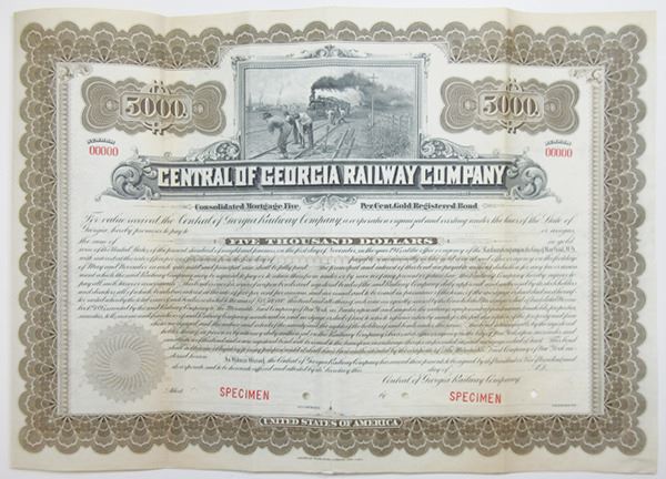 Georgia. $5,000 Registered 5% Specimen Consolidated Mortgage Gold Bond, Black print on brown border and under tint on horizontal format, Locomotive approaching with track workers at siding, Specimen overprints and POC's, VF-XF condition, ABNC. Specimen listed on Cox has overprint stamp- this version does not.