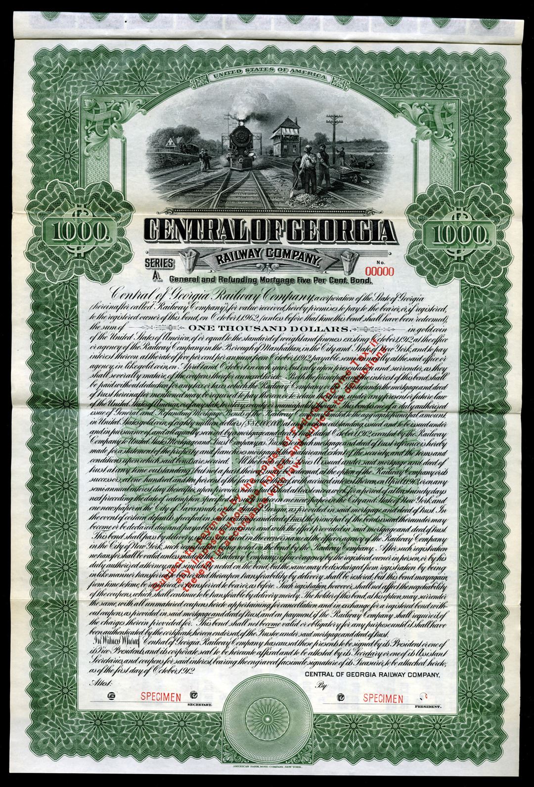 Georgia. $1000 Specimen 5% Series A General and Refunding Mortgage Bond, Black print on large green border and under tint, Men repairing tracks beside on oncoming locomotive at top, Specimen overprints and POC's, VF-XF condition, FBNC.