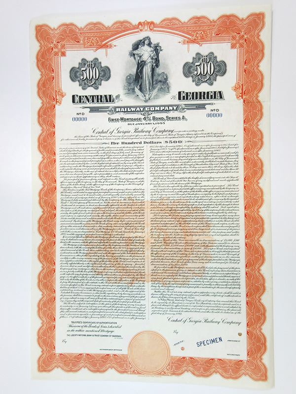 Georgia. $500 Specimen 4% Series A 1st Mortgage Coupon Bond, Black print on orange border and under tint, Allegorical woman at top, Specimen overprints and POC's, VF-XF condition, ABNC.