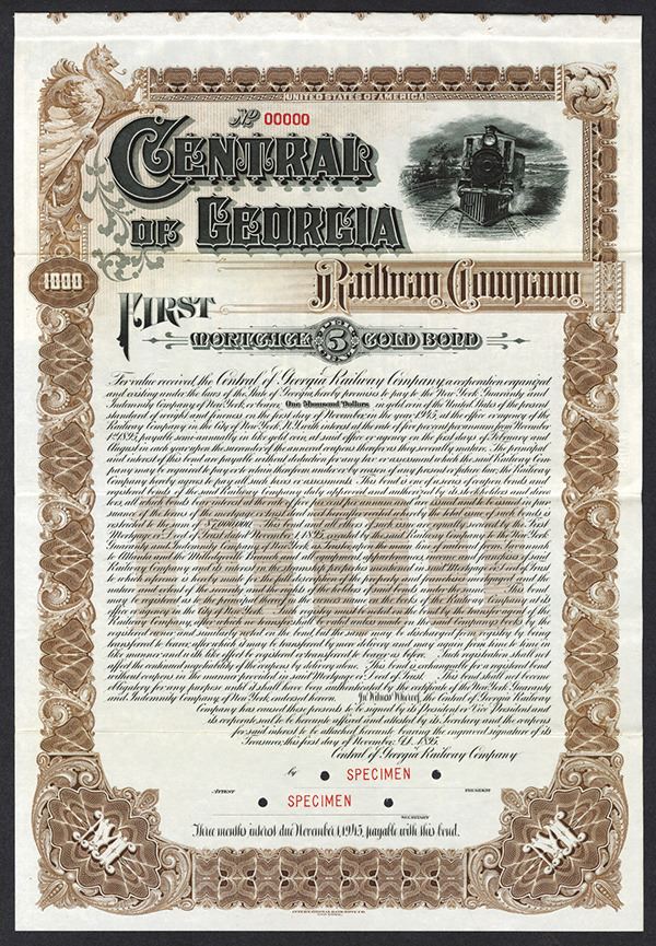 Georgia, 1895, $1000, 1st Mortgage, 5% Gold Bond, Black on brown, ornate title with locomotive straight on upper right, coupons attached, XF condition. International BNC.
