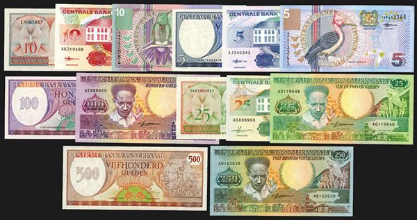 Suriname. 5, 10, 25, 100, 500 Gulden, SCWPM 120-124 Very Fine to EF; 25, 100, 250 Gulden SCWPM 132-134 Unc.; 5, 10, 25 Gulden, SCWPM 136-138 Unc.; 5, 10 Gulden SCWPM 146, 147. Unc.; 13 pieces.