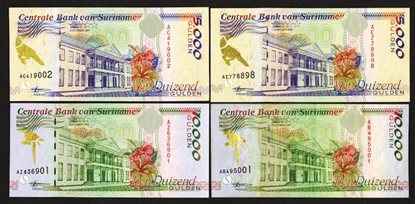 Suriname. 5000, 10,000 gulden. P-143a 5.10.1997; b 1.2.1999; 144 (Serial # prefix AB), 145 (Serial # prefix AZ). One of each Very Choice Uncirculated, the other two AU and VF+. 4 pieces. (Arthur C. Matz Collection).
