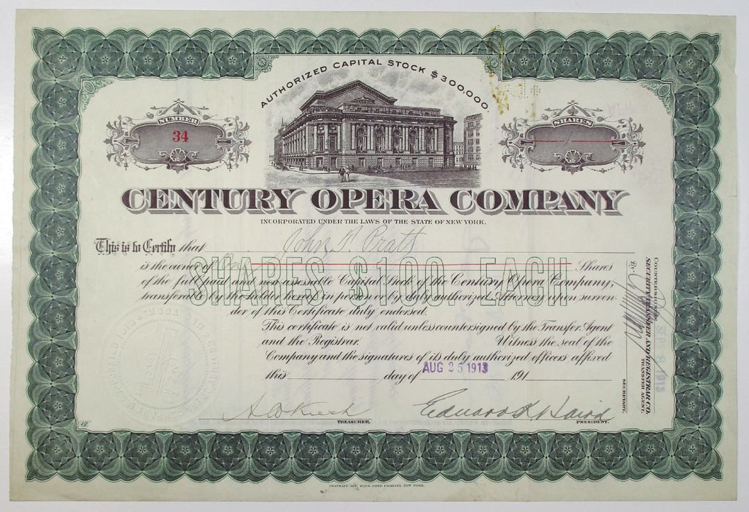 New York, 1913. 1 Share I/U Capital Stock Certificate, S/N 34, Black text with green border and underprint, Large opera house at top center. Fine-VF condition, FLBN. It was incorporated on May 9, 1913. It was funded with a capital stock of $300,000. Edward Kellogg Baird, was president. Otto Hermann Kahn was vice-president, and Alvin W. Krech was the treasurer. In 1914, with Agide Jacchia conducting, the company premiered Guido Ferranti by Jane Van Etten, one of the first American operas by a female composer to be produced by a regular opera company.