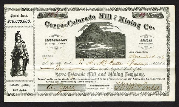 Arizona Mine, incorporated in California. 10 Shrs Stock Certificate. Issued. VF+