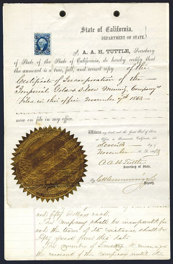 California, 5 page official copy of Certificate of Incorporation. The corporation was formed for silver & gold mining in Amador County, California. Large gold foil seal on front page signed by A.A.H. Tuttle, Secretary of State of the State of California. VF condition.