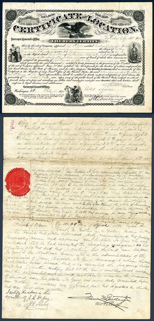 New Orleans, Louisiana, 1891, Certificate # 550, 160 acres, Redeemed Certificate of Location for property located in Louisiana, the back is completely covered with the Notary and the attestation of the certificate holder, Patriotic eagle and shield on top middle, Native American on right, Allegorical woman on left and man in kilts on bottom, VF condition, Printed by BEP but designed and engraved by Columbian BNC.