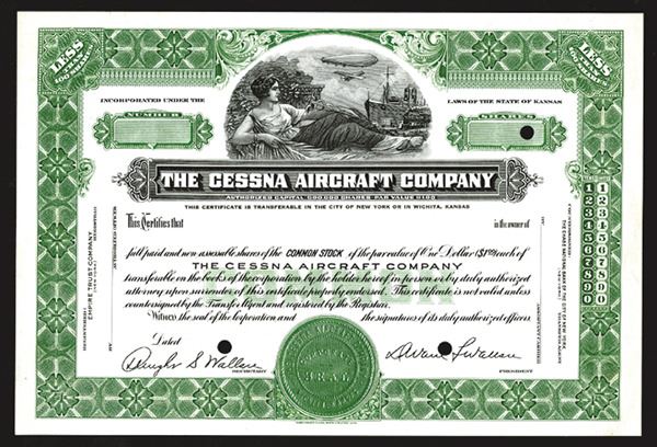Kansas. <100 Shares Common Stock Specimen Certificate. Black print with a dark green border and under tint. Image at top of an allegorical female reclining, watching an zeppelin, a locomotive, and a steam ship. POC's, VF-XF condition. NBNC. Cessna's nephews, Dwane Wallace and his brother Dwight, bought the company from Cessna in 1934. They reopened it and began the process of building it into what would become a global success. The Cessna C-37 was introduced in 1937 as Cessna's first seaplane when equipped with Edo floats. In 1940, Cessna received their largest order to date, when they signed a contract with the U.S. Army for 33 specially equipped Cessna T-50s. Later in 1940, the Royal Canadian Air Force placed an order for 180 T-50s. Facsimile signature of Duane Wallace as president.