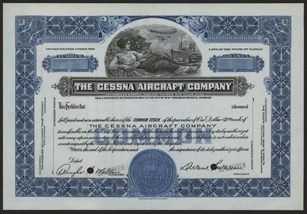 Kansas. Odd Shares Common Stock Specimen Certificate, Specimen stock certificate. Reclining allegorical woman with steamship, train, monoplane and Zeppelin. Blue Border. Rare early Cessna stock certificate with Dwane Wallace facsimile signature. Extremely rare aviation certificate. Specimen overprints and POC's, VF-XF condition, NBNC.