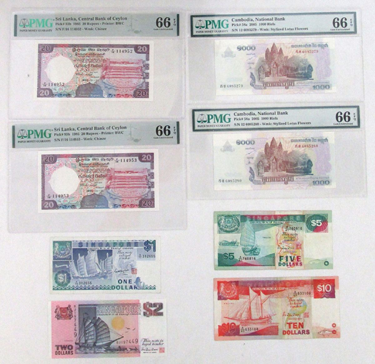 Southeast Asia, 1985-2005. Lot of 8 Issued Banknotes, Includes: Central Bank of Ceylon, 1985, 20 Rupees, P-93b (2), Sequential Pair, PMG graded Gem Uncirculated 66 EPQ; Board of Commissioners of Currency, ND (1987) to ND (1997), 1 Dollar, P-18a; 5 Dollars, P-19; 10 Dollars, P-20; 2 Dollars, P-34; National Bank of Cambodia, 2005, 1000 Riels, P-58a (2), Sequential Pair, PMG graded Gem Uncirculated 66 EPQ. Notes range from XF to UNC condition. (8). Sold "AS IS" no returns accepted.