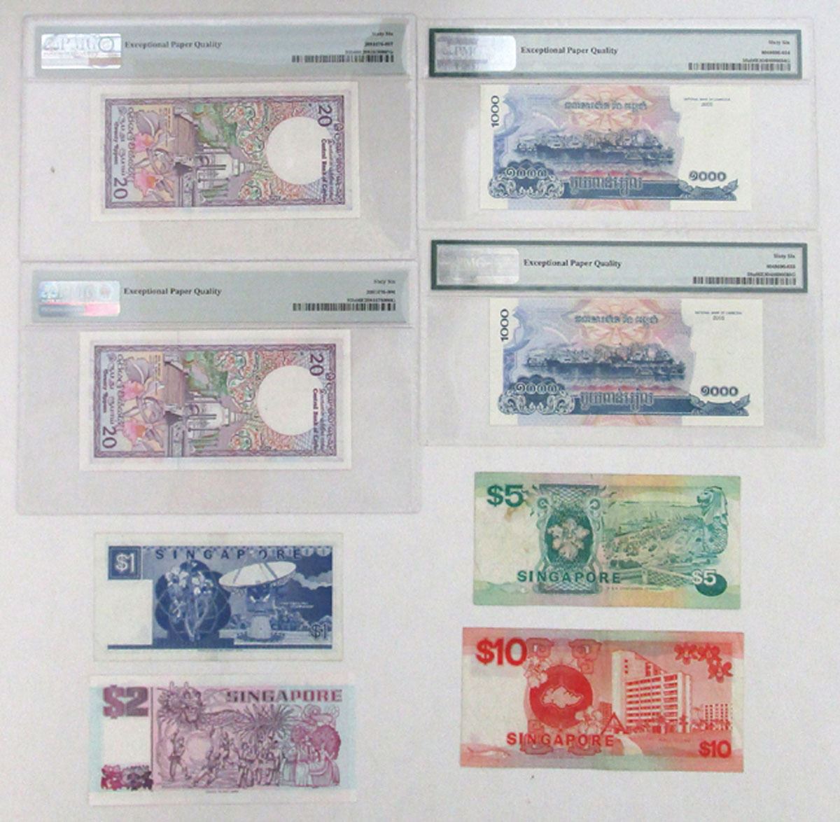 Southeast Asia, 1985-2005. Lot of 8 Issued Banknotes, Includes: Central Bank of Ceylon, 1985, 20 Rupees, P-93b (2), Sequential Pair, PMG graded Gem Uncirculated 66 EPQ; Board of Commissioners of Currency, ND (1987) to ND (1997), 1 Dollar, P-18a; 5 Dollars, P-19; 10 Dollars, P-20; 2 Dollars, P-34; National Bank of Cambodia, 2005, 1000 Riels, P-58a (2), Sequential Pair, PMG graded Gem Uncirculated 66 EPQ. Notes range from XF to UNC condition. (8). Sold "AS IS" no returns accepted.