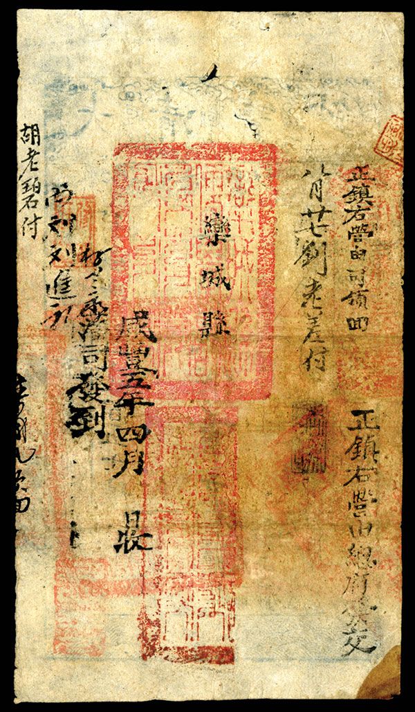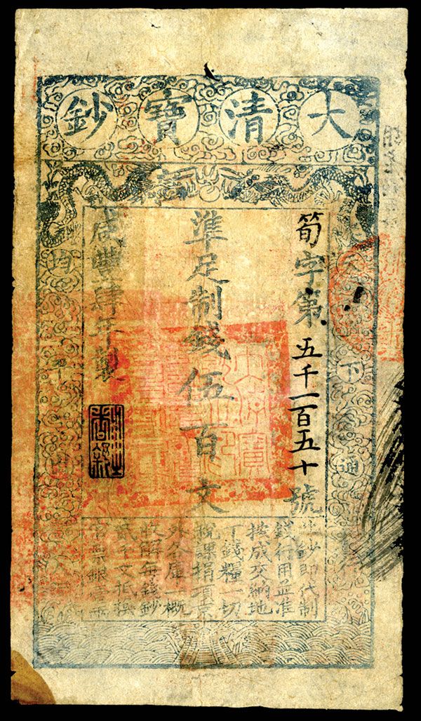China, (Year 4), 1854, 500 Cash, P-A1b (S/M#T6-10), Issued banknote, The usual Spindle hole on top margin, S/N 5150, Fine to Choice Fine with a 1 inch internal tear that is difficult to see.