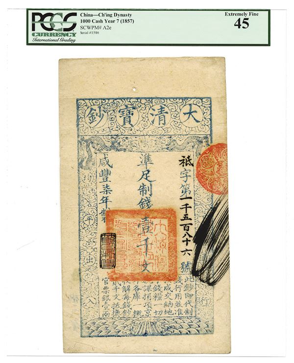 China, (Year 7), 1857, 1000 Cash, P-A2e (S/M#T6-41), Issued banknote, S/N 1586, The usual Spindle hole on top margin, PCGS graded Extremely Fine 45. Very attractive note and high condition for the issue.