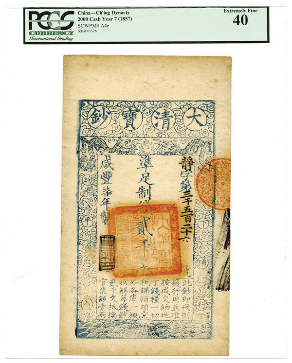 China, 1857, 2000 Cash, P-A4e (S/M#T6-42), Issued banknote, S/N 3526, PCGS graded Extremely Fine 40, very attractive for issue.