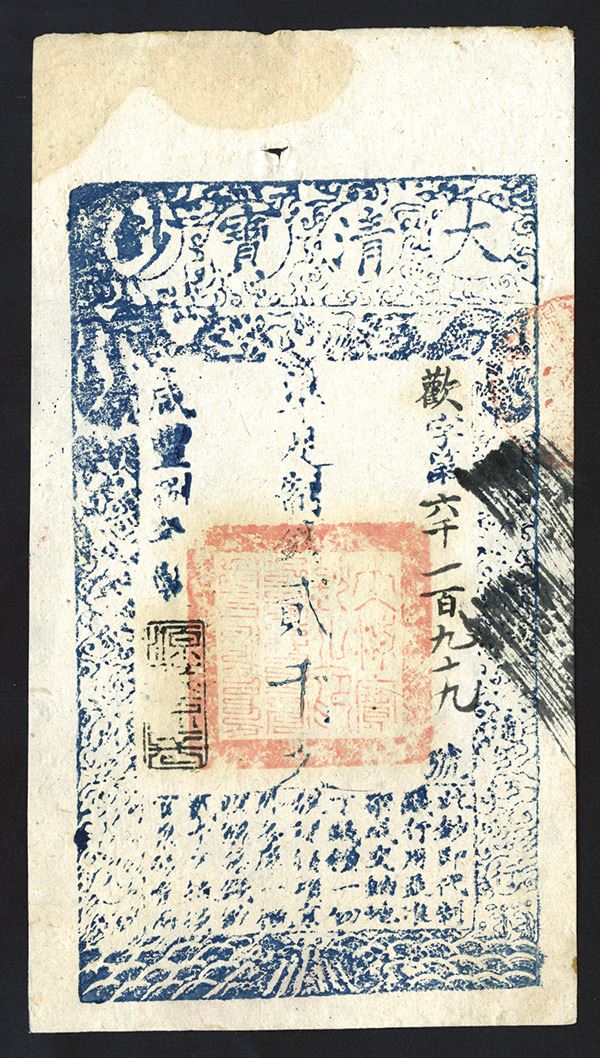 China, (Year 8), 1858, 2000 Cash, P-A4f (S/M#T6-51), Issued, The usual Spindle holes on top margin, S/N 6199, the second of 2 sequential notes, Choice AU to Uncirculated with a light water stain on the top left corner. (Pogrebetsky Family Archives, Part 2)