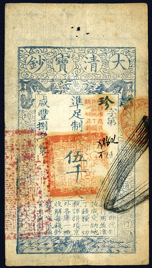 (Year 8), 1858, 5000 Cash, P-A5c (S/M#T6-52), Issued, The usual Spindle holes on top margin, Choice VF to XF condition.