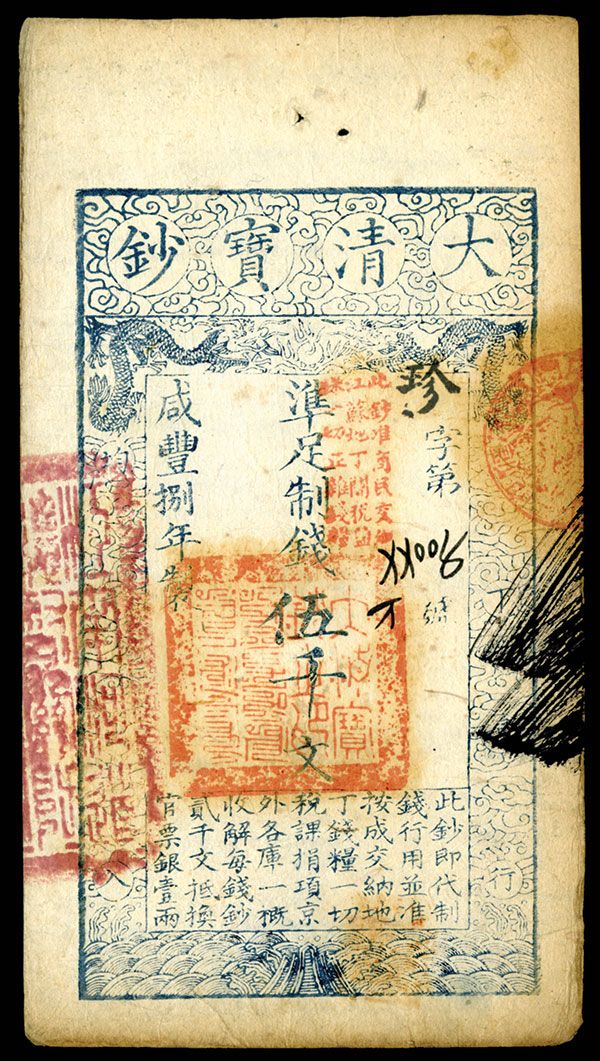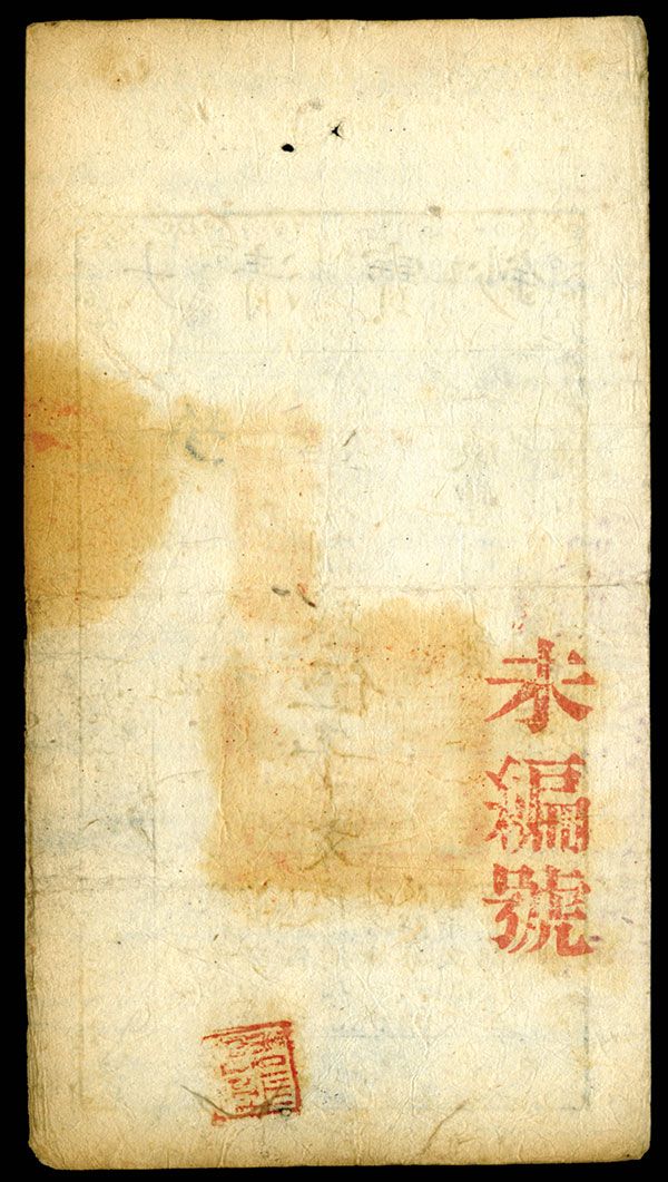 China, (Year 8), 1858, 5000 Cash, P-A5c (S/M#T6-52), Issued banknote, The usual Spindle hole on top margin, S/N 44005, VF to Choice VF. Attractive note for issue.