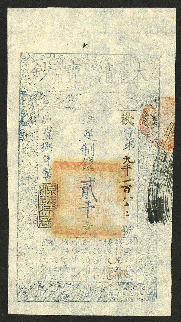 China, (Year 8), 1858, 2000 Cash, P-A4f (S/M#T6-51), Issued banknote, the note appears in Uncirculated to Choice Uncirculated condition with no folds and the usual spindle hole on top, very attractive for issue and one of the nicest examples we have run across. (From the Rev. Coole Collection).